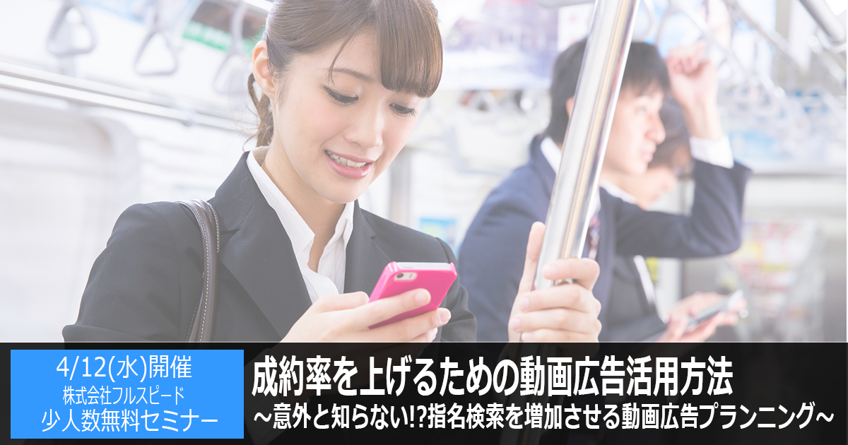 株式会社フルスピード(本社:東京都渋谷区、代表取締役社長:友松功一、以下「当社」)は、動画広告を活用して成果を上げるための手法やそのプランニングについて解説する無料セミナー「成約率を上げるための動画広告活用方法~意外と知らない!?指名検索を増加させる動画広告プランニング~」を 2017年4月12日(水)に開催します。